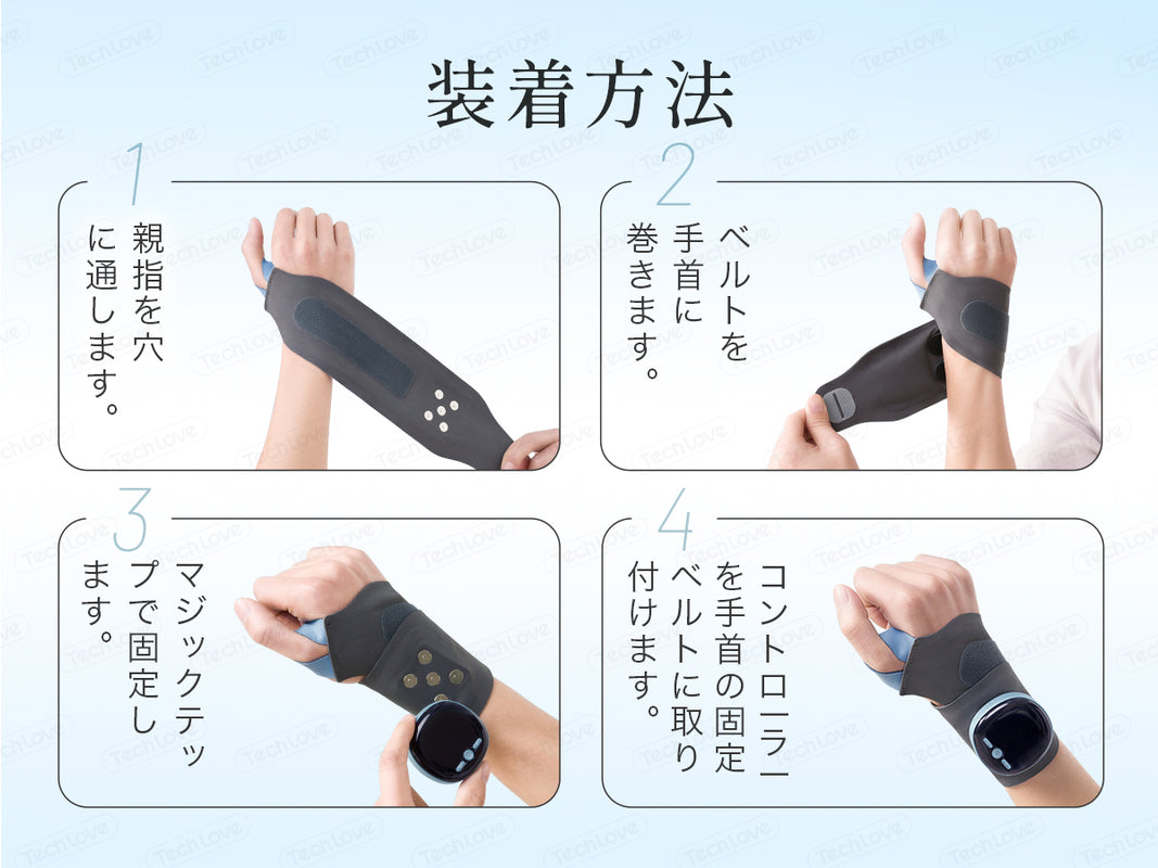 Introducing Techlove Smart Wrist Support, a completely new type of wrist support that combines EMS and heat functions! Thorough care from the thumb to the deep muscles of the wrist! The two comfortable functions provide gentle relaxation, firmly fix tendonitis, tfcc damage, and wrist sprains, and reduce strain.
