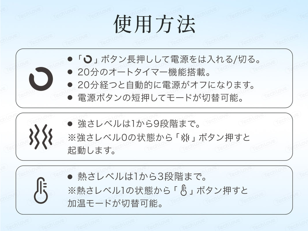 The 4050mm² heating pad provides quick and uniform heating over a wide area. It gently warms the wrist and offers comfortable heat care with three levels to choose from. We also recommend using only the heat function during cold seasons or in air-conditioned rooms.